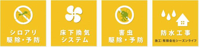 シロアリ・ハチ・ムカデの駆除をはじめ、床下換気施工・FRP防水などを専門に手がけています。