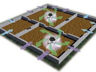 従来の床下換気扇は、基礎外周北側の換気口またはその付近に設置し、南側の換気口から外気を床下へ導入させようとするものでした。しかし床下の南北に風を縦断させようとするこの手法では、空気の移動距離がとても長く、実際にはショートカットや内部損失により、設置台数の割りに通風が弱くなってしまうというデメリットがありました。
